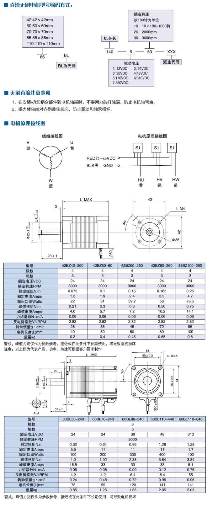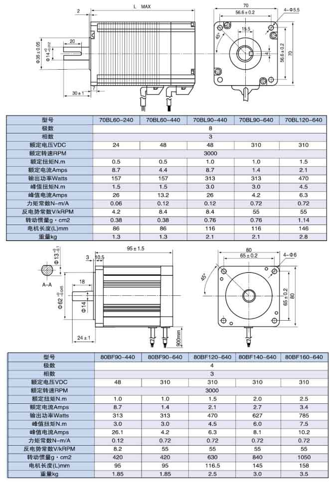 無刷電機(jī)采用了4極和8極轉(zhuǎn)子設(shè)計(jì),機(jī)型號(hào)有42、57、60、70、80、86、110;0.1Nm到6Nm的連續(xù)轉(zhuǎn)矩;高性能釹鐵硼磁鋼提供3倍以上的峰值扭矩。